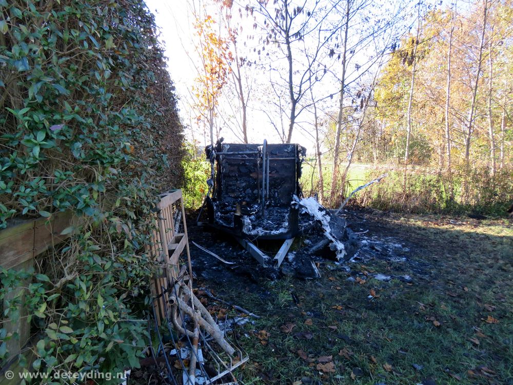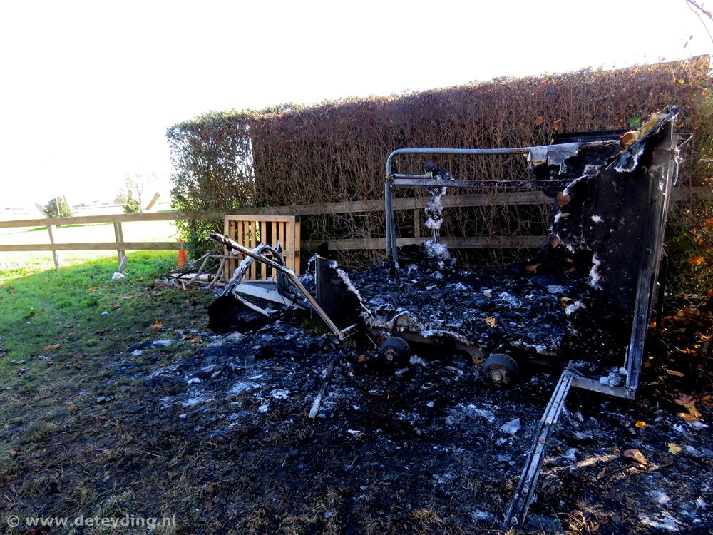 De paardentrailer die afgelopen donderdag is uitgebrand.