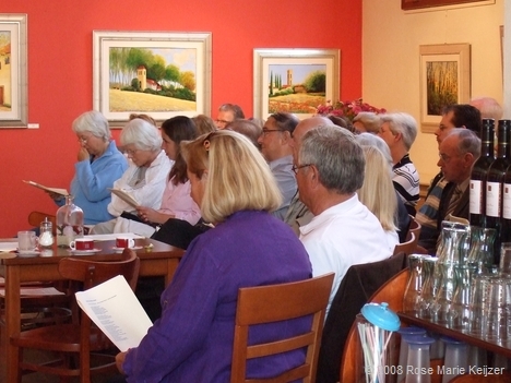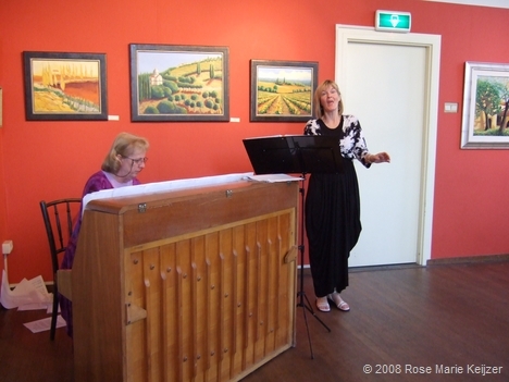 WARMOND, 15 september 2008 – Het kunstcafé De Galerie aan de Warmondse Dorpsstraat Vulde zich zondag aan het eind van de ochtend met liefhebbers van zangmuziek. Dorien van Rumt (zang) en Erna van der Brug (piano) verzorgden er een gratis concert omdat ze beiden zo blij zijn dat het kunstcafé mag blijven. “We doen het voor Cor en Janneke”, aldus Van Rumt, “We zijn zo blij dat dit unieke plekje kan blijven.” (Foto's: Rose Marie Keijzer)
