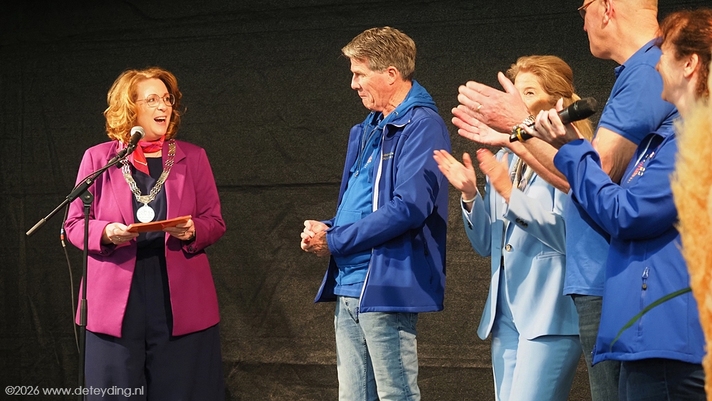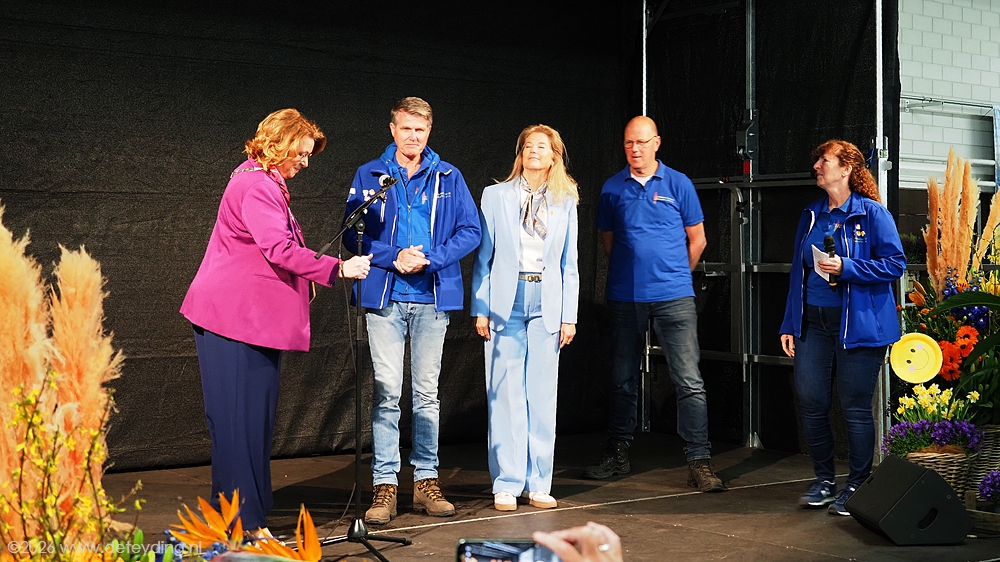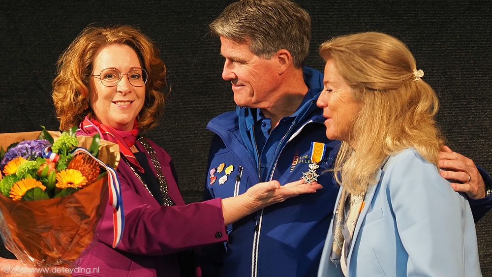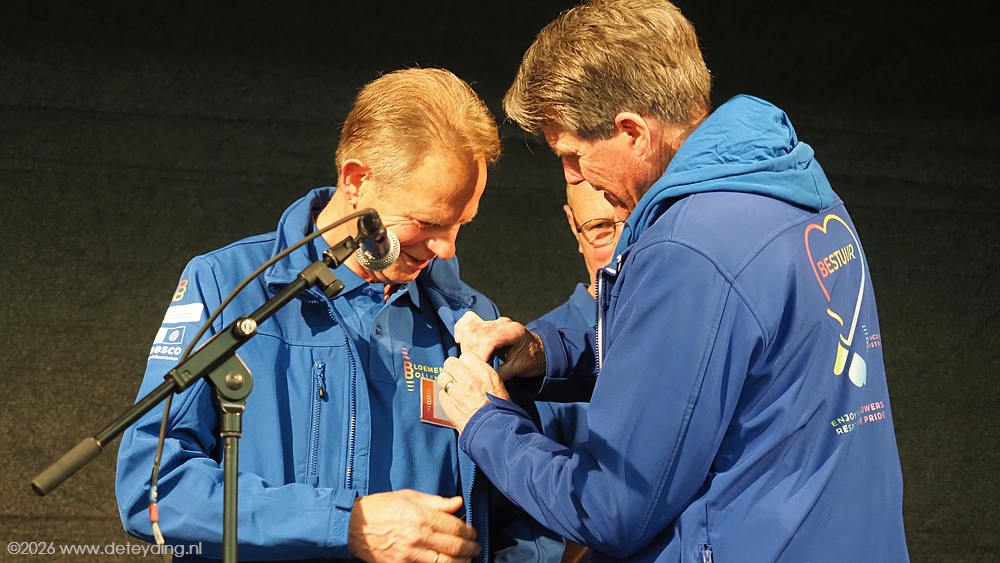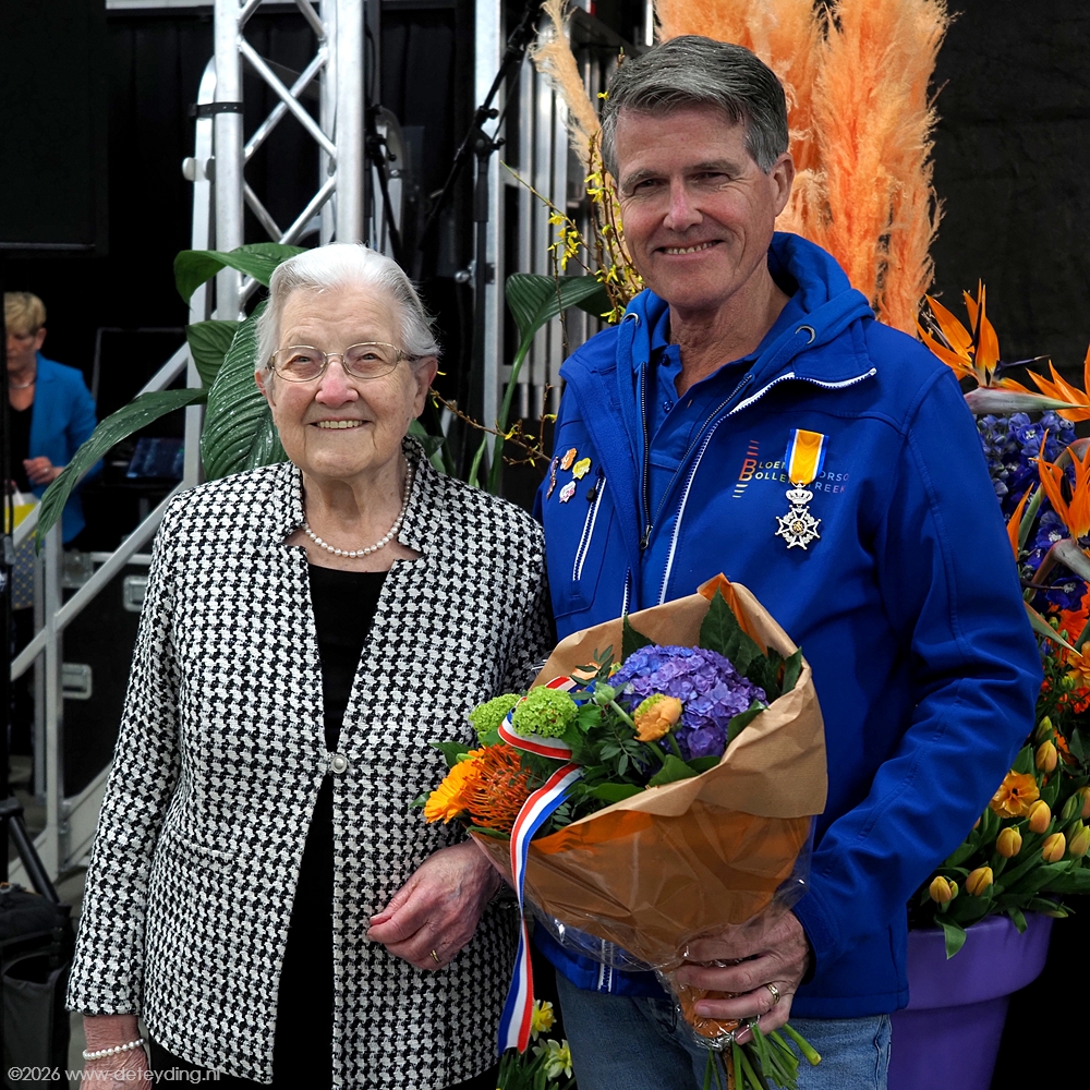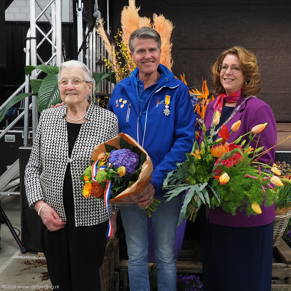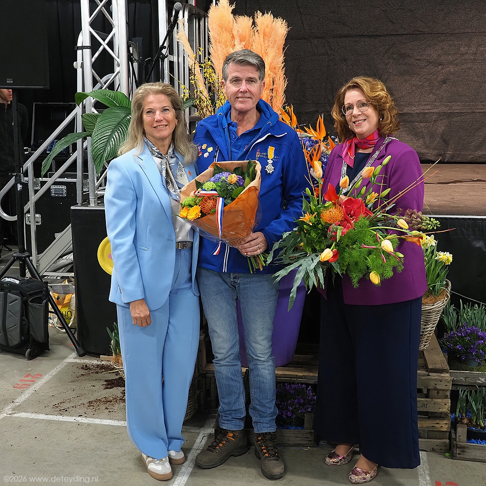 SASSENHEIM/REGIO, 15 april 2026 – Willem Heemskerk heeft vanochtend uit handen van burgemeester Breuer een Koninklijke Onderscheiding ontvangen. Dat gebeurde in de hal van JUB Holland in Noordwijkerhout, waar het corso wordt opgebouwd. Heemskerk werd Ridder in de Orde van Oranje Nassau. De uitreiking vond plaats ter gelegenheid van zijn afscheid als voorzitter van het Bloemencorso Bollenstreek. Foto’s Henk Keijzer