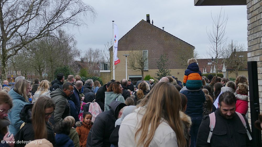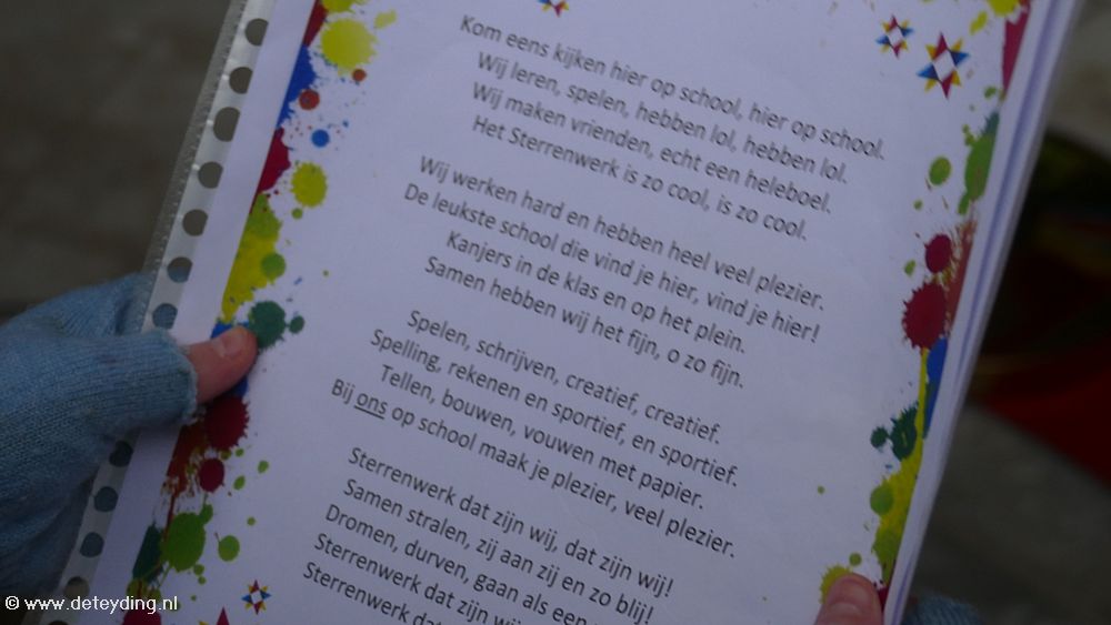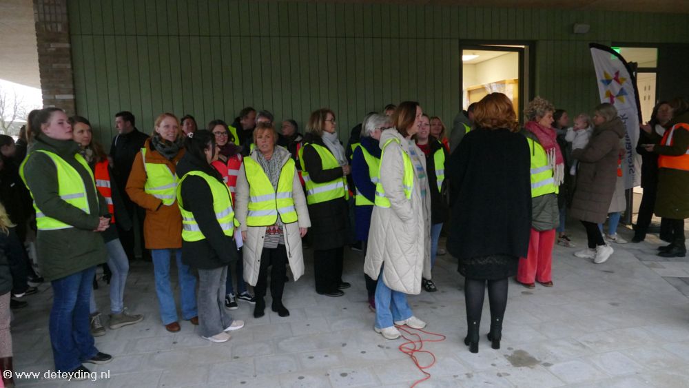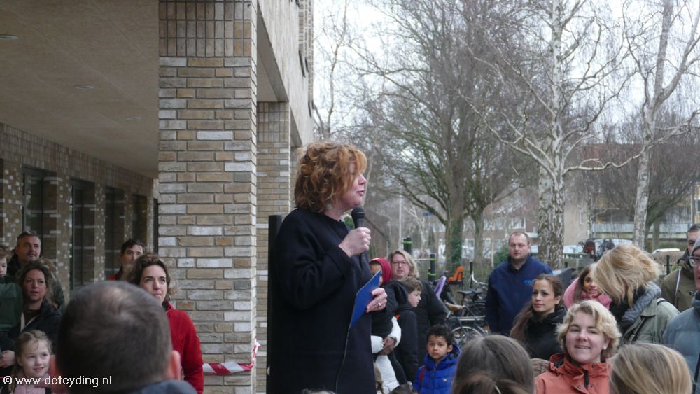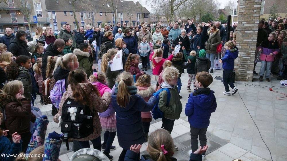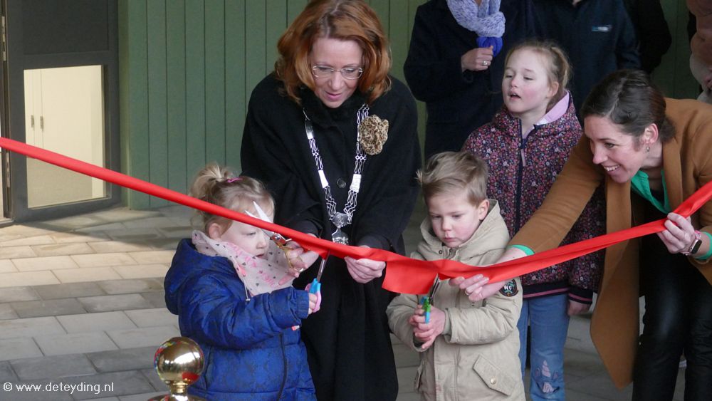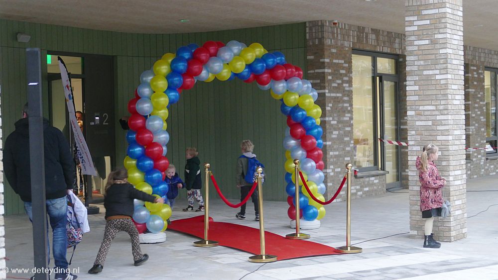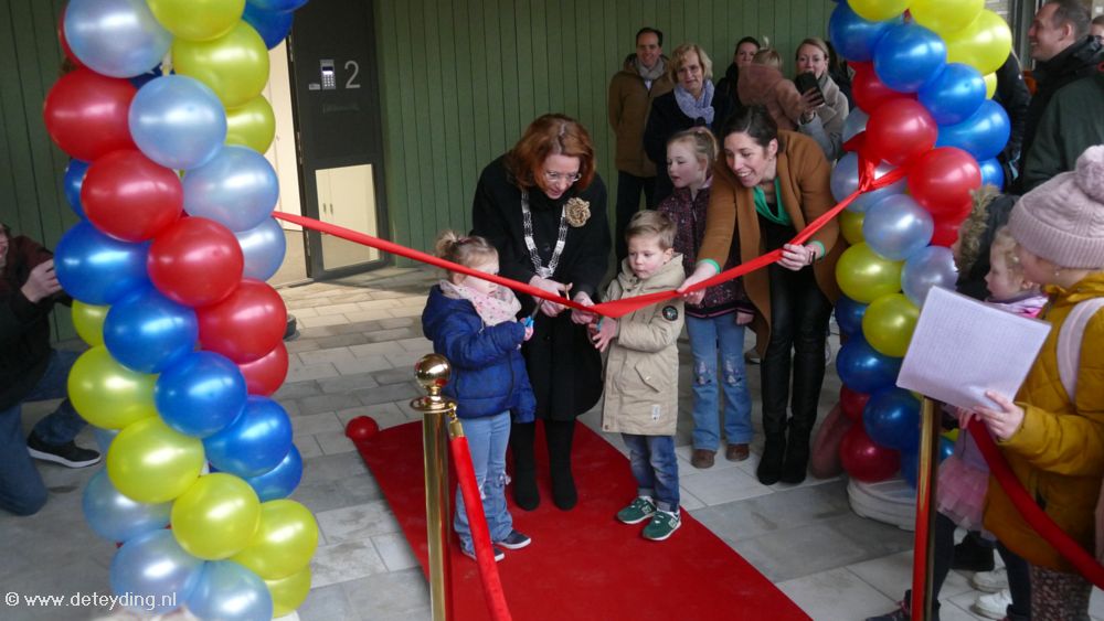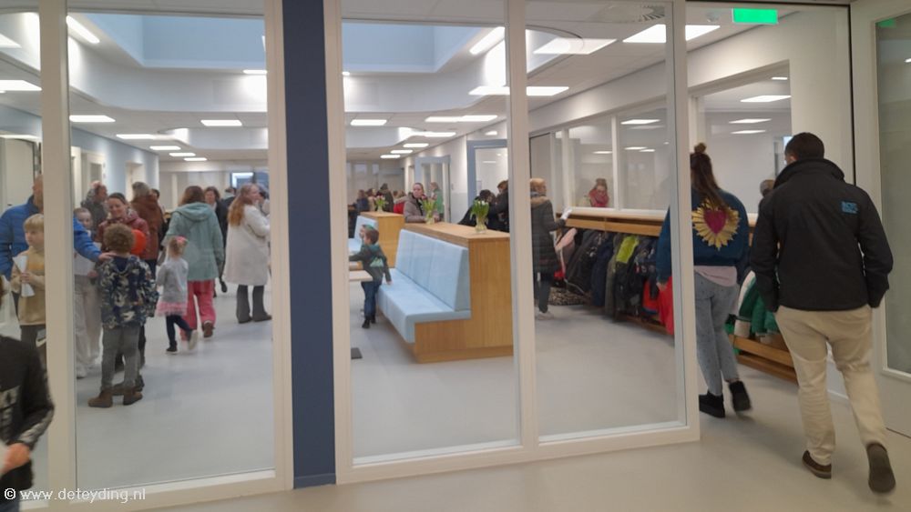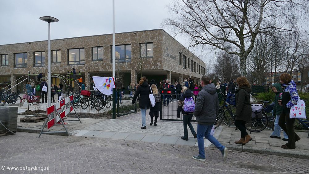 Het feest begon buiten. Wachtend op de burgemeester en de wethouder dansten de kinderen de kou weg. Na het hijsen van de vlag en het zingen van een lied over wat ze op school allemaal doen, was het tijd om de school van binnen te bekijken. Iedereen die over de rode loper de school in liep werd door de burgemeester gefeliciteerd en verwelkomd. De kinderen kregen een speurtocht waarmee ze door het hele gebouw konden lopen.