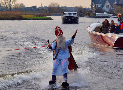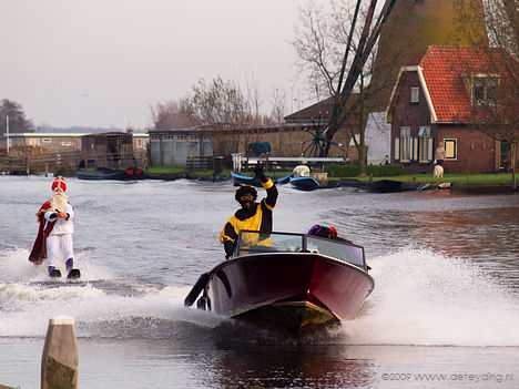 WARMOND, 21 november 2009 – Terwijl de Warmondse jeugd reikhalzend uitkijkt naar de komst van de statige goedheiligman, zwelt een luid gebrom aan en verschijnt er een speedboot op de Leede, met daarachter, op waterski's … Sinterklaas. (foto's en panoramafoto Henk Keijzer)