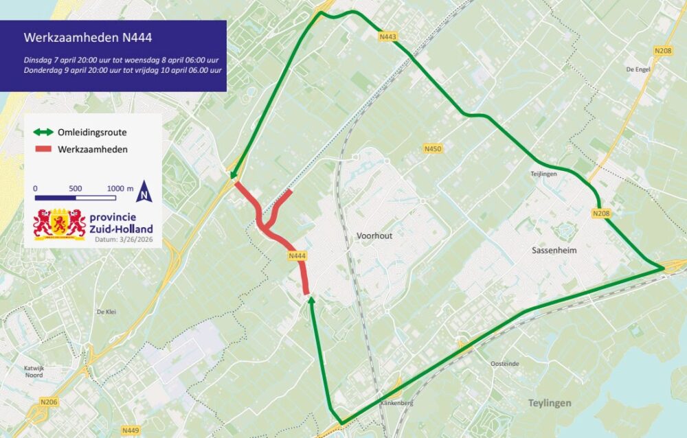 N444 twee avonden en nachten afgesloten tussen rotonde Herenstraat en Noordwijk