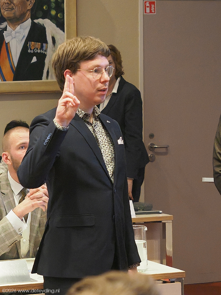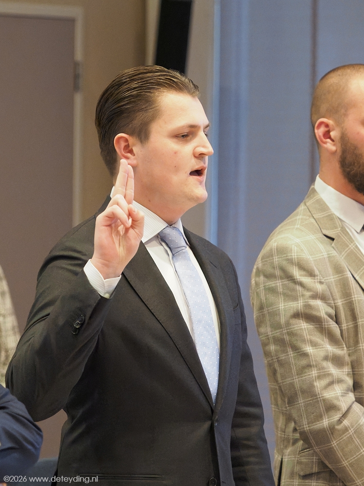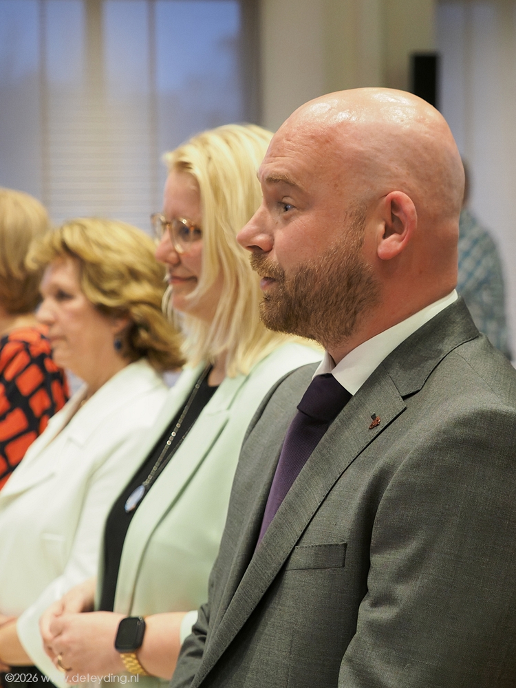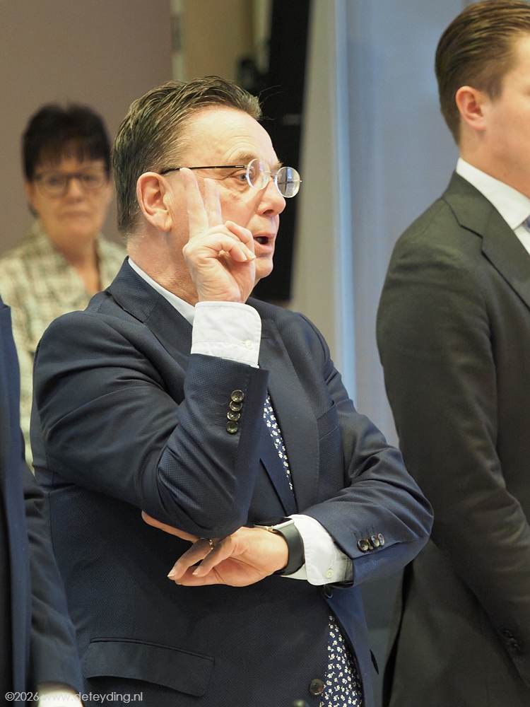 TEYLINGEN, 1 april 2026 – “Zo waarlijk helpe mij God almachtig” of “dat verklaar en beloof ik”. De 25 leden van de nieuwe gemeenteraad spraken vanavond de woorden uit die horen bij de eed of belofte die zij afleggen alvorens met hun raadswerk te kunnen beginnen. Verder werden er onder andere burgerleden benoemd. Ook zij legden de eed of de belofte af. Foto’s Henk Keijzer