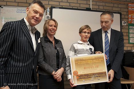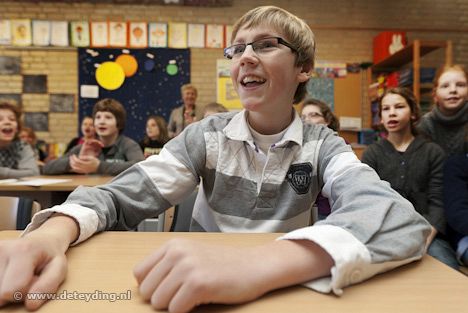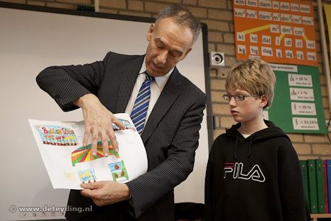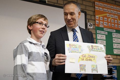 SASSENHEIM, 26 januari 2010 – UPDATE Roy Guyt uit groep 8 van de Sassenheimse basisschool De Rank heeft het winnende ontwerp gemaakt voor een mozaïekbank voor het nieuwe station Sassenheim. Roy kreeg dit woensdagochtend in de klas te horen van wethouder Leo van der Zon. (Foto's: Laurens Lindhout)