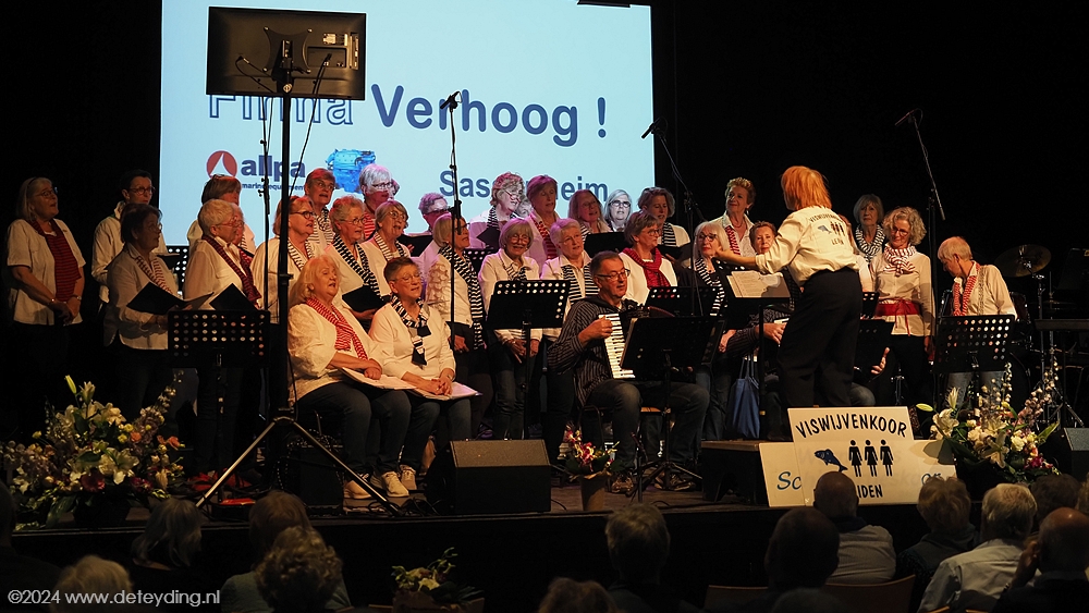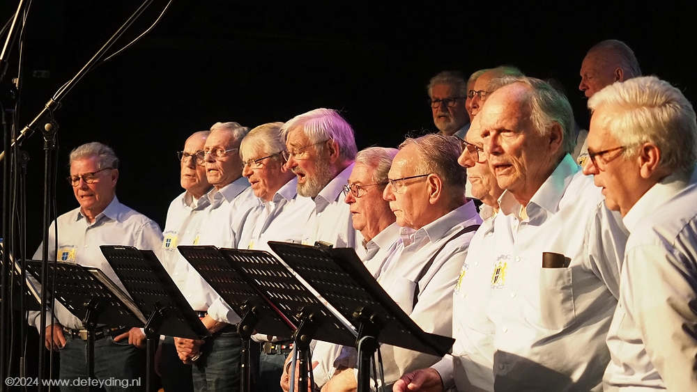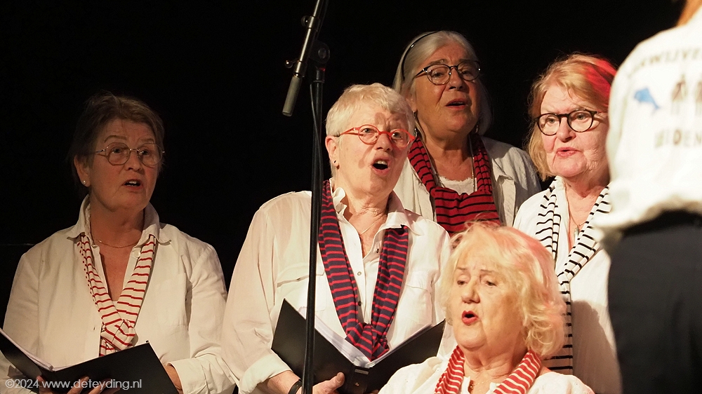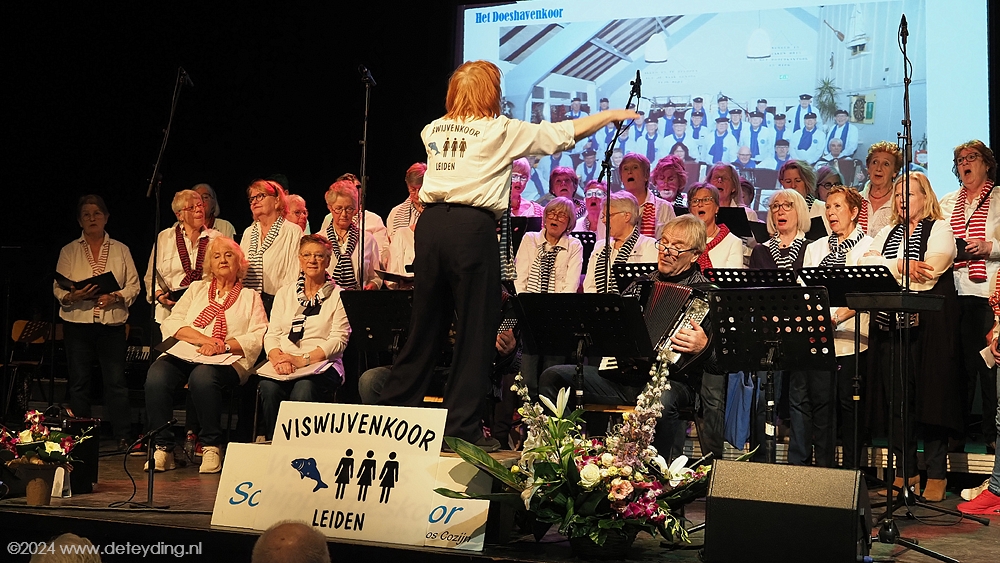 Want wat doet een koor als het jarig is? Zingen natuurlijk. Maar niet alleen. Twee gastkoren, het Doeshavenkoor uit Leiderdorp en het Viswijvenkoor uit Leiden, traden ook op. De koren zongen afzonderlijk, maar ook samen. Het feest in het Trefpunt werd afgesloten met een optreden van de pretband  Ex BTW.