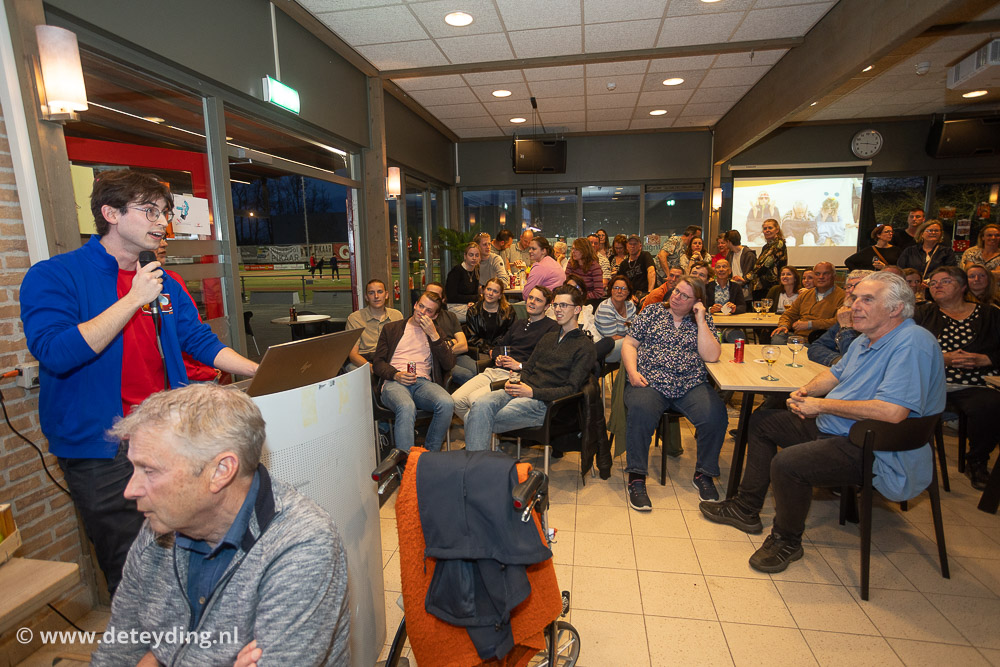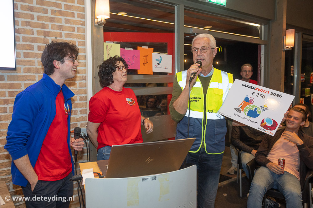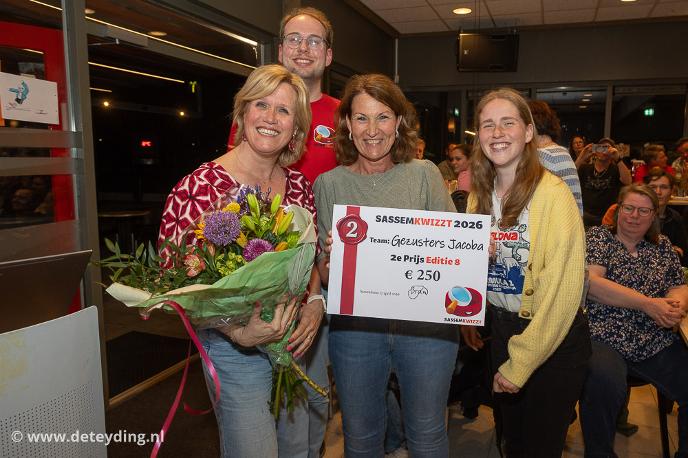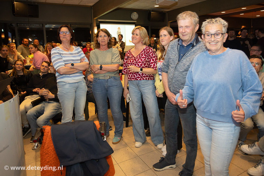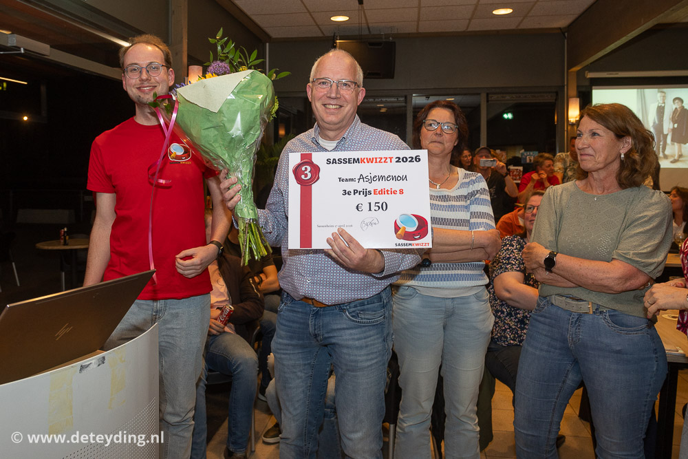 SASSENHEIM, 18 april 2026 – Team ‘Ghostbusters’ heeft de achtste editie van de dorpsquiz SassemKwizzt gewonnen. Tweede werden ‘Gezusters Jacoba’ en de derde prijs ging naar ‘Asjemenou’. De uitslagenavond voor de 53 deelnemende teams werd vrijdag gehouden in een volle kantine van korfbalvereniging TOP. Foto’s Edwin van der Wijngaard.