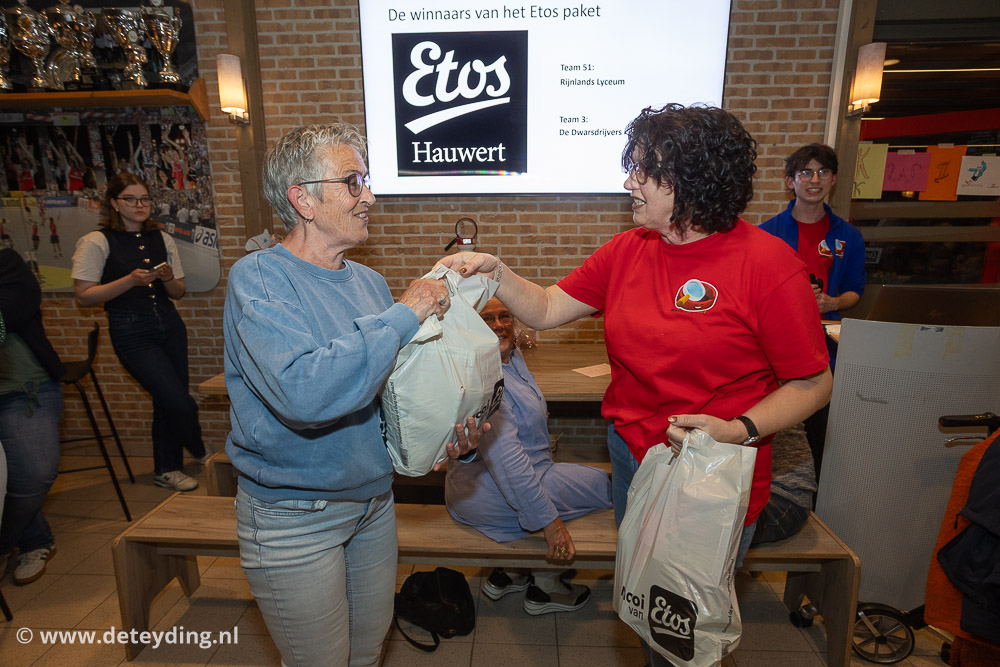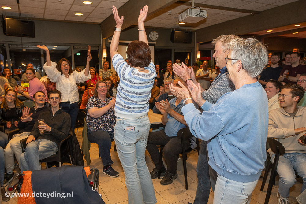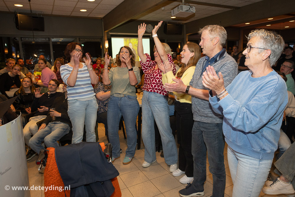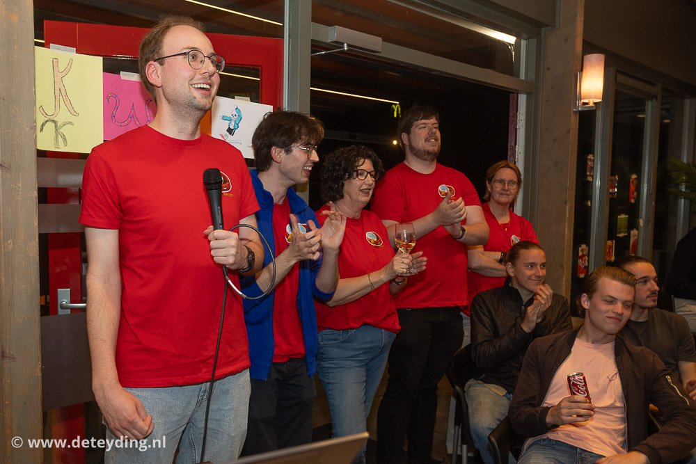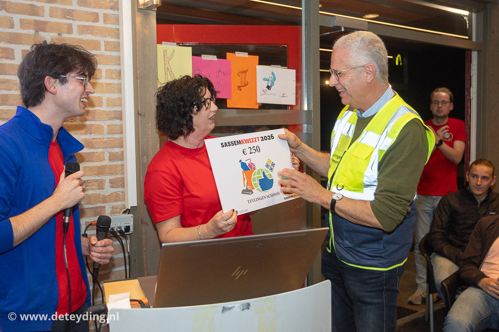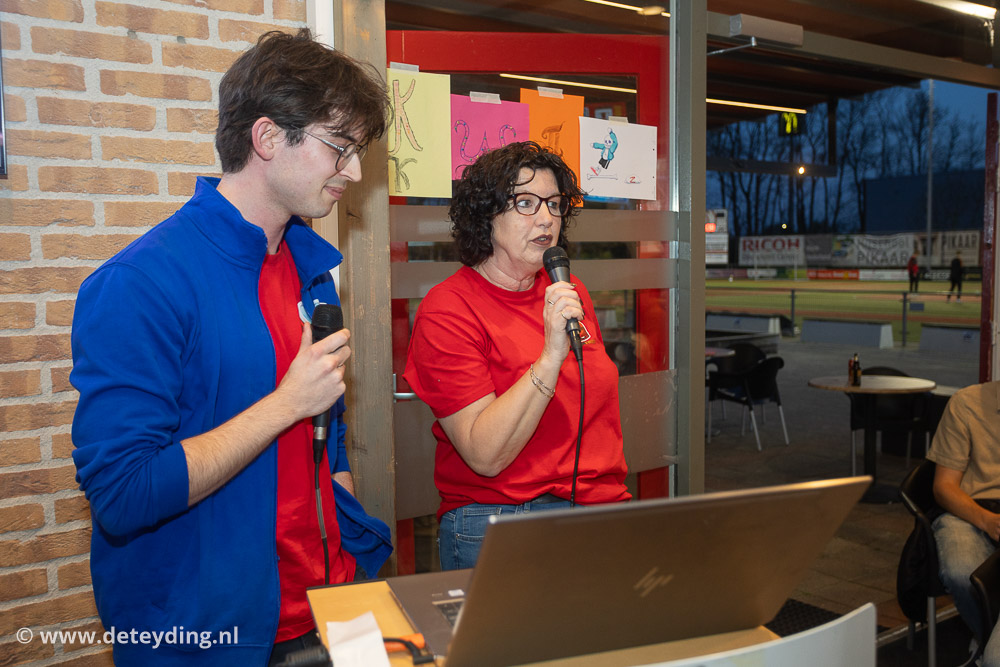 SASSENHEIM, 18 april 2026 – Team ‘Ghostbusters’ heeft de achtste editie van de dorpsquiz SassemKwizzt gewonnen. Tweede werden ‘Gezusters Jacoba’ en de derde prijs ging naar ‘Asjemenou’. De uitslagenavond voor de 53 deelnemende teams werd vrijdag gehouden in een volle kantine van korfbalvereniging TOP. Foto’s Edwin van der Wijngaard.