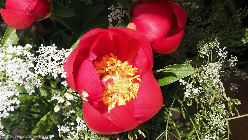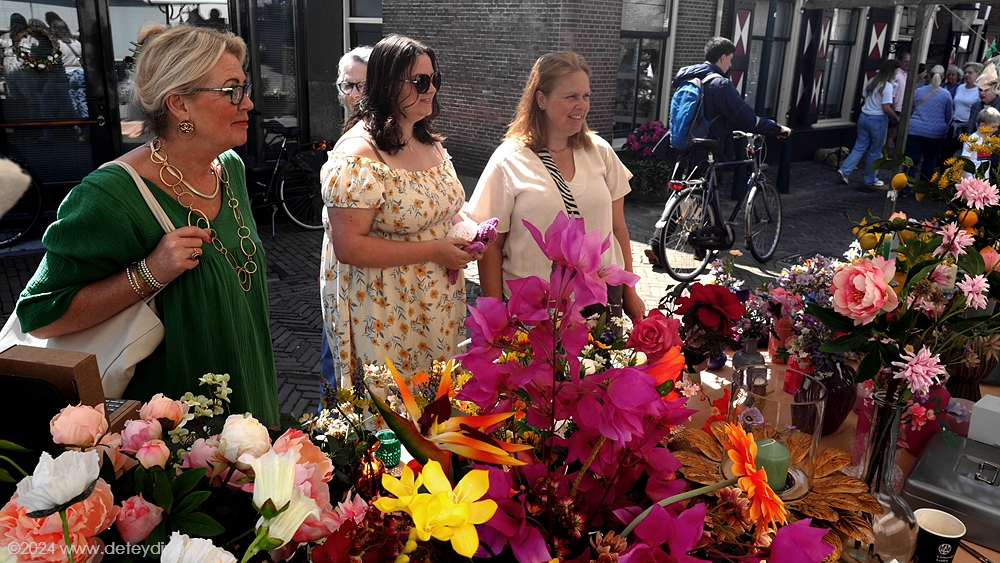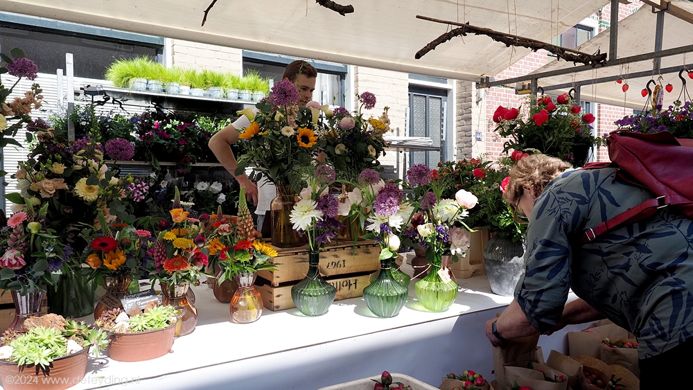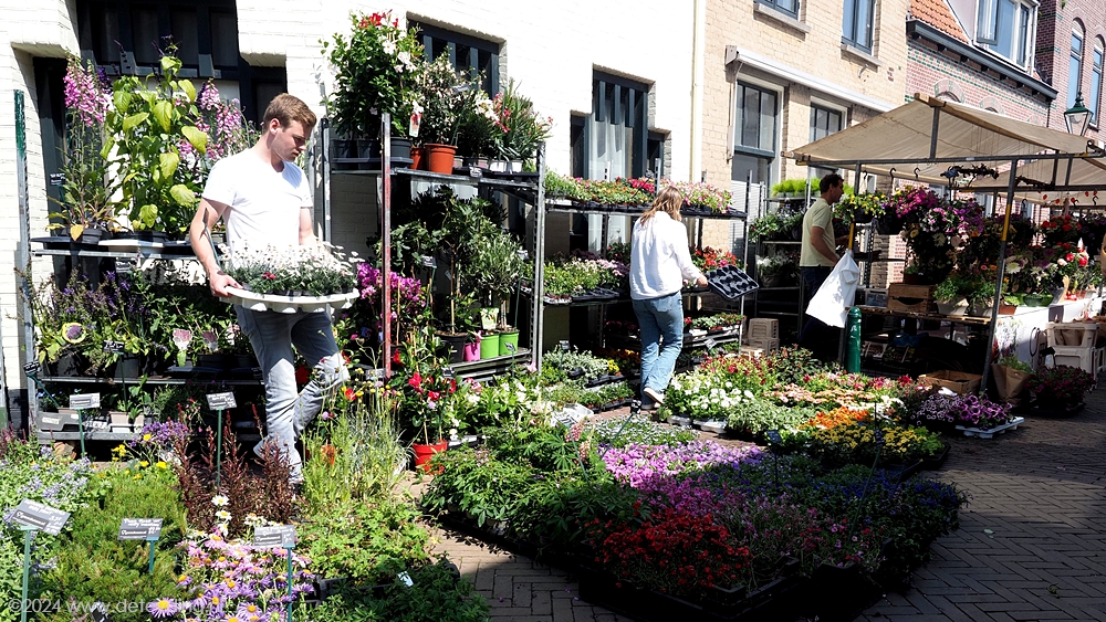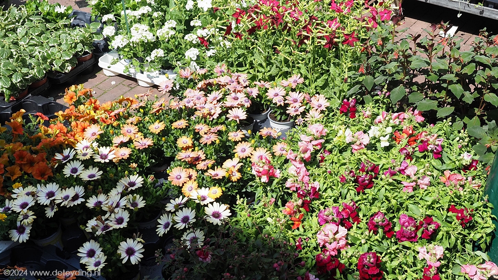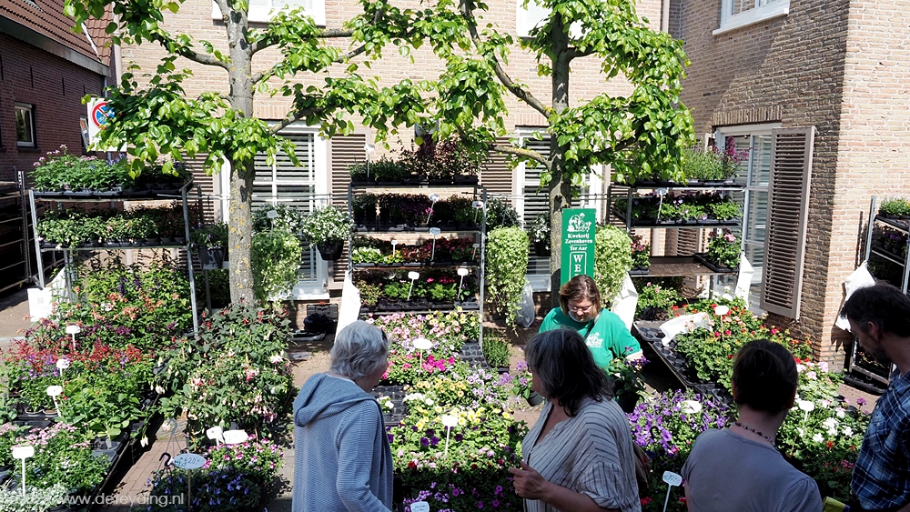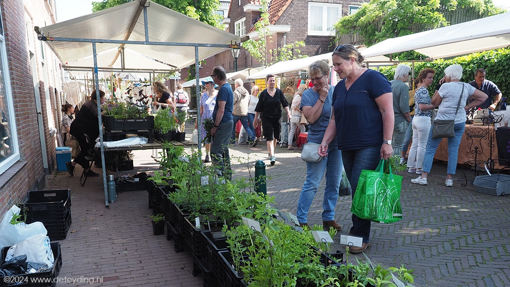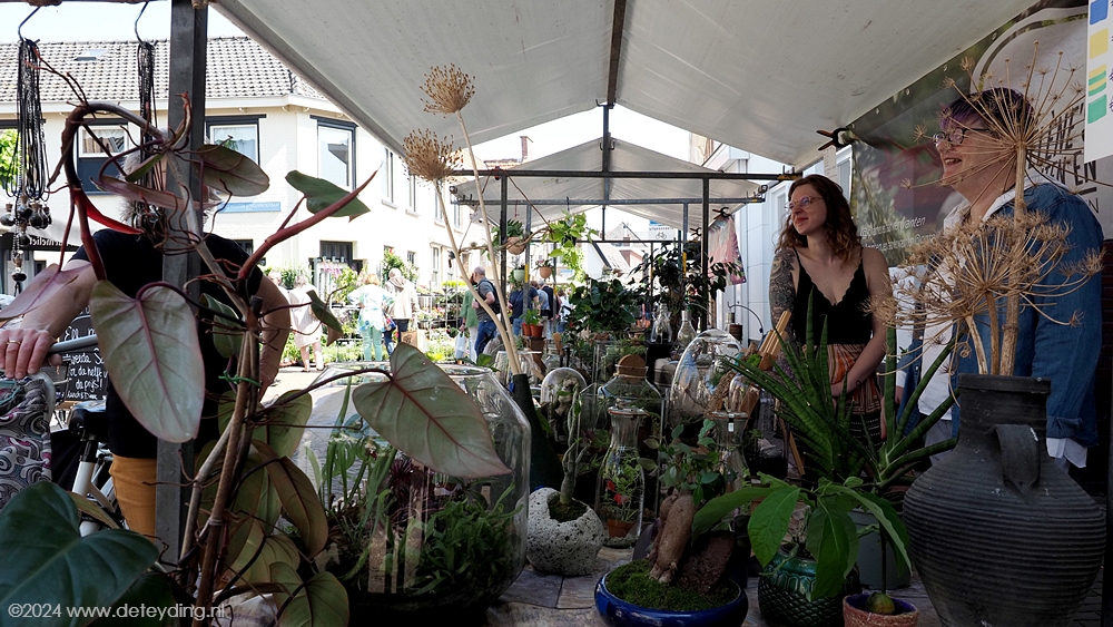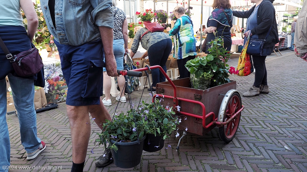 Naast een variëteit aan planten, kruiden en bloemdecoraties waren er ook diverse stands met spullen die je in de tuin kunt gebruiken als plantenhangers en serviezen. De markt baadde vandaag in het zonnetje. Bezoekers vervoerden hun gekochte spullen niet alleen in zakken en tassen, maar ook in grote kratten en zelfs kruiwagens. De terrassen en galerieën hadden niet te klagen over gebrek aan belangstelling.