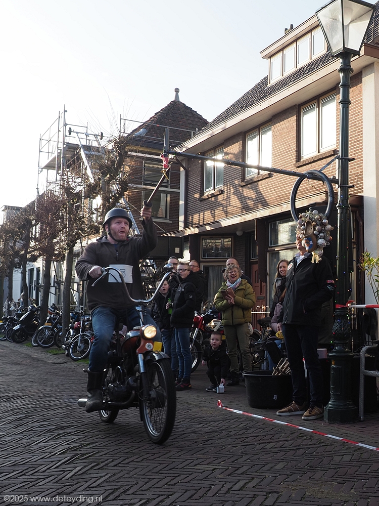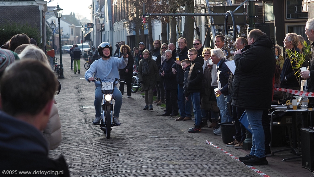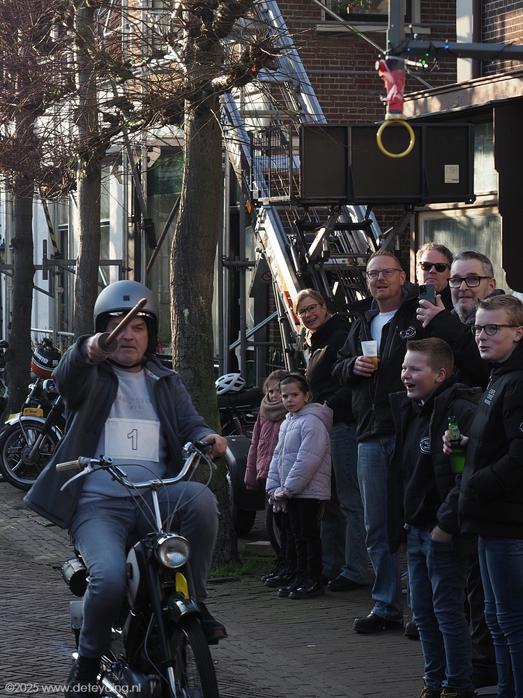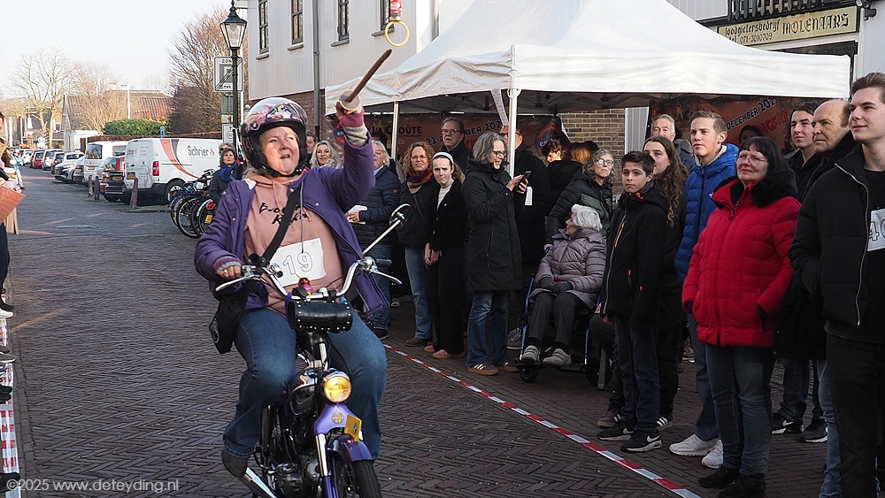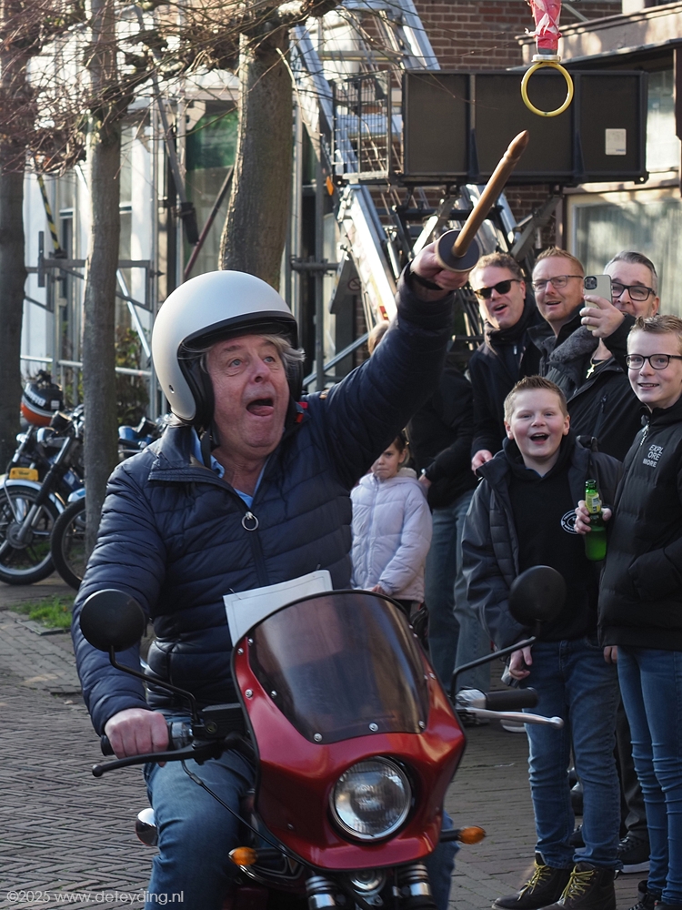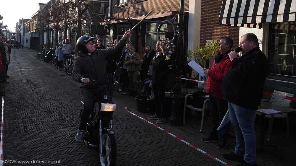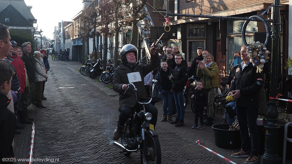WARMOND, 21 december 2025 – Vanmiddag vond in de Dorpsstraat voor de tweede keer het Warmonds Kampioenschap (WK) ringsteken te brommer plaats. De brommers zijn oldtimers en de wedstrijd gaat vooral om het plezier dat de deelnemers hebben door ring te steken vanaf hun oude, fraai onderhouden vervoermiddel. Foto’s Henk Keijzer